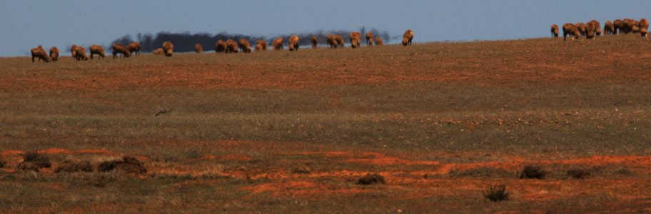 その揺らめく地平線にたたずむのは、赤い‥群れ‥。それは、羊の群れであった。